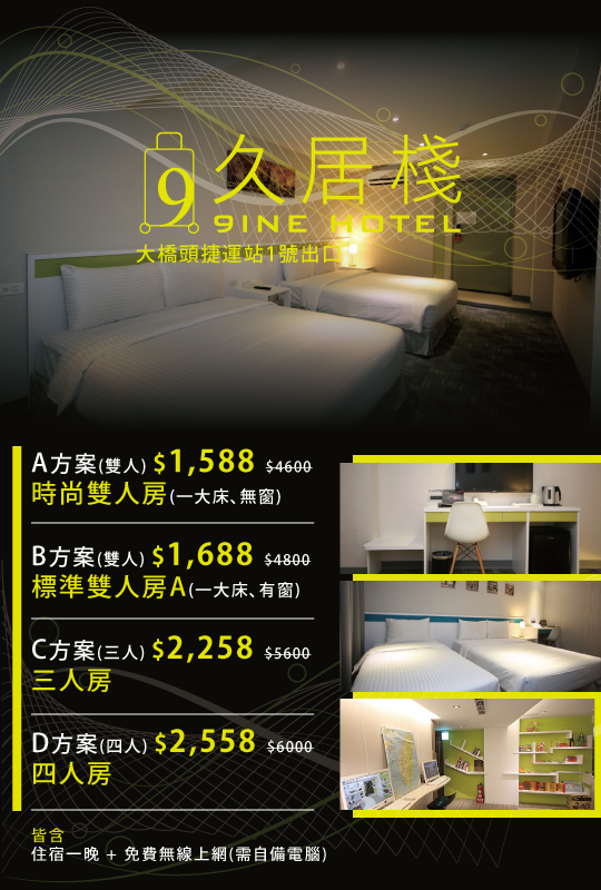 只要1588元起,即可享有【台北-力麗久居棧旅店】大橋頭捷運站1號出口AB.雙人/C.三人/D.四人方案〈含A. 時尚雙人房(一大床、無窗)/B.標準雙人房A(一大床、有窗)/C.三人房/D.四人房 住宿一晚 + 免費無線上網(需自備電腦)〉