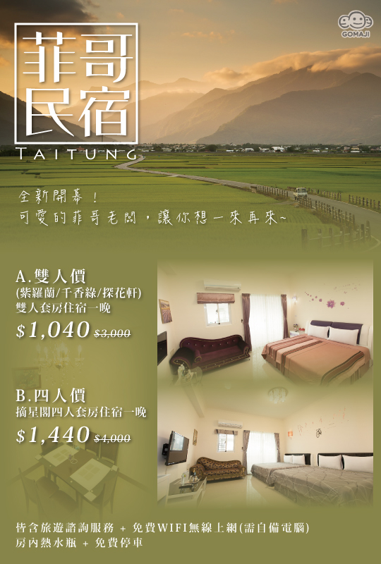 台東-菲哥民宿 - 138287是最近關注的一項還算不錯的商品,一樣是在Gomaji上發現的。我真的非常喜歡逛Gomaji,尤其很多東西價格都很不錯,也有不少優惠券可以用,下面是賣場提供的商品簡介: