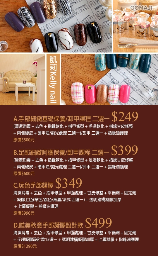 凱莉Kelly nail - 139680是最近關注的一項還算不錯的商品,一樣是在Gomaji上發現的。我真的非常喜歡逛Gomaji,尤其很多東西價格都很不錯,也有不少優惠券可以用,下面是賣場提供的商品簡介: