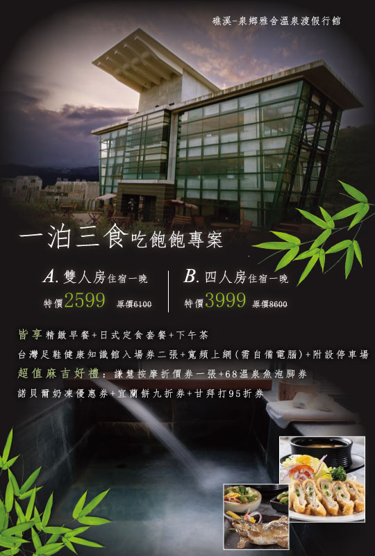 只要2599元起,即可享有【礁溪-泉鄉雅舍溫泉渡假行館】三館通用住宿聯賣劵~一泊三食標準房吃飽飽專案A.雙人/B.四人〈含A.雙人房/B.四人房 住宿一晚 + 精緻早餐 + 日式定食套餐 + 下午茶 + 台灣足鞋健康知識館入場券二張 + 寬頻上網(需自備電腦) + 附設停車場〉超值麻吉好禮:謙慧按摩折價券一張 + 68溫泉魚泡腳券 + 諾貝爾奶凍優惠券 + 宜蘭餅九折券 + 甘拜打95折券