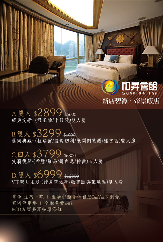 只要2899元起,即可享有【和昇會館-新店碧潭?帝景飯店】暢遊碧潭河畔~浪漫雙人渡假住宿方案ABD.雙人/C.四人〈含A.經典文學- (君王論/十日談)雙人房 / B.藝術典藏- (拉斐爾/波堤切利/米開朗基羅/達文西)雙人房 / C.文藝復興-(希臘/羅馬/哥白尼/神曲)四人房 / D.VIP蜜月主題-(仲夏夜之夢/羅密歐與茱麗葉)雙人房 住宿一晚 + 豪華中西合併自助Buffet吃到飽 + 室內停車場 + 全館免費wifi,BCD方案另享按摩浴缸〉