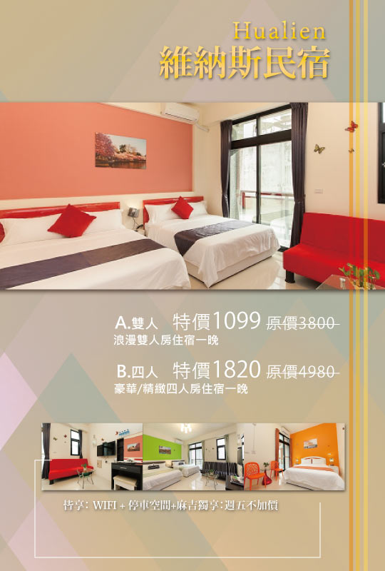 只要1099元起,即可享有【花蓮-維納斯民宿】花蓮住宿A.雙人/B.四人專案〈含A.浪漫雙人房/B.(豪華/精緻四人房)住宿一晚 + wifi + 停車空間〉麻吉獨享:週五不加價